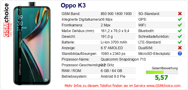 Hast du eigene Webseite? Willst du die Informationen über Standarddaten des Handys Oppo K3 irgendwo veröffentlichen? Das ist sehr einfach. Du kannst das Bild herunterladen oder kopieren und auf der Webseite folgenden Code hinzufügen:Das Einfügen von diesem Code verursacht das Anzeigen von dem folgenden Bild: