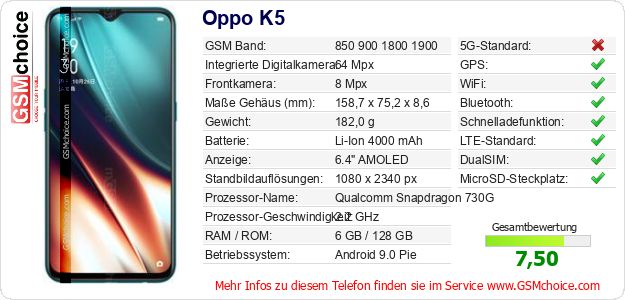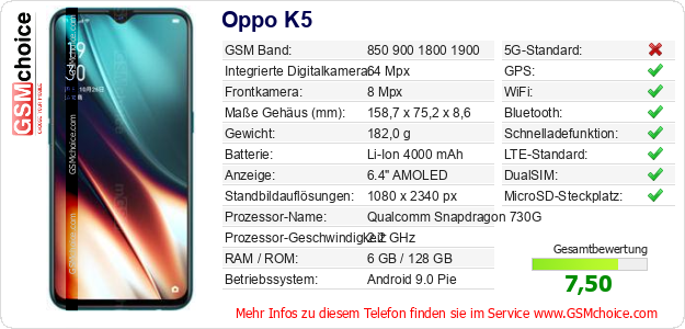 Hast du eigene Webseite? Willst du die Informationen über Standarddaten des Handys Oppo K5 irgendwo veröffentlichen? Das ist sehr einfach. Du kannst das Bild herunterladen oder kopieren und auf der Webseite folgenden Code hinzufügen:Das Einfügen von diesem Code verursacht das Anzeigen von dem folgenden Bild: