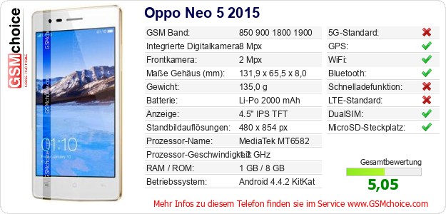 Hast du eigene Webseite? Willst du die Informationen über Standarddaten des Handys Oppo Neo 5 2015 irgendwo veröffentlichen? Das ist sehr einfach. Du kannst das Bild herunterladen oder kopieren und auf der Webseite folgenden Code hinzufügen:Das Einfügen von diesem Code verursacht das Anzeigen von dem folgenden Bild: