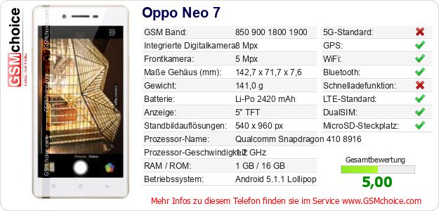 Hast du eigene Webseite? Willst du die Informationen über Standarddaten des Handys Oppo Neo 7 irgendwo veröffentlichen? Das ist sehr einfach. Du kannst das Bild herunterladen oder kopieren und auf der Webseite folgenden Code hinzufügen:Das Einfügen von diesem Code verursacht das Anzeigen von dem folgenden Bild: