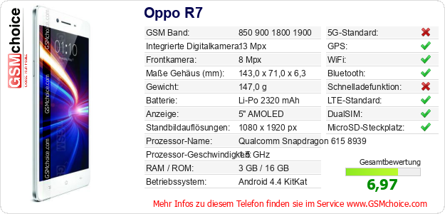 Hast du eigene Webseite? Willst du die Informationen über Standarddaten des Handys Oppo R7 irgendwo veröffentlichen? Das ist sehr einfach. Du kannst das Bild herunterladen oder kopieren und auf der Webseite folgenden Code hinzufügen:Das Einfügen von diesem Code verursacht das Anzeigen von dem folgenden Bild: