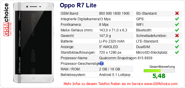 Hast du eigene Webseite? Willst du die Informationen über Standarddaten des Handys Oppo R7 Lite irgendwo veröffentlichen? Das ist sehr einfach. Du kannst das Bild herunterladen oder kopieren und auf der Webseite folgenden Code hinzufügen:Das Einfügen von diesem Code verursacht das Anzeigen von dem folgenden Bild: