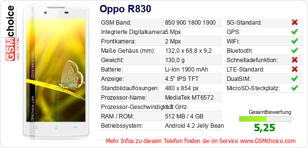 Hast du eigene Webseite? Willst du die Informationen über Standarddaten des Handys Oppo R830 irgendwo veröffentlichen? Das ist sehr einfach. Du kannst das Bild herunterladen oder kopieren und auf der Webseite folgenden Code hinzufügen:Das Einfügen von diesem Code verursacht das Anzeigen von dem folgenden Bild: