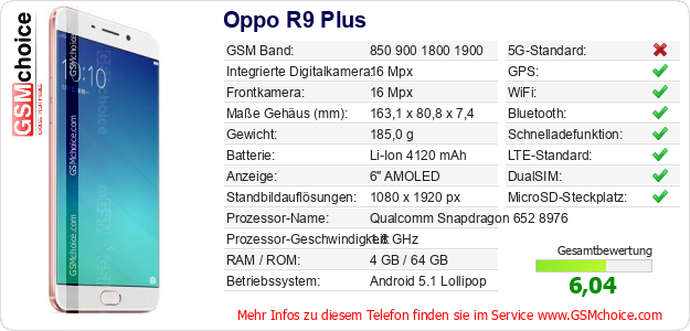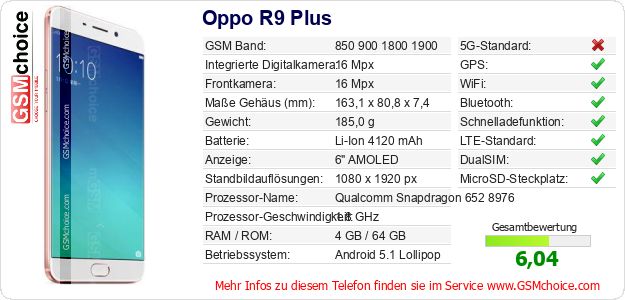 Hast du eigene Webseite? Willst du die Informationen über Standarddaten des Handys Oppo R9 Plus irgendwo veröffentlichen? Das ist sehr einfach. Du kannst das Bild herunterladen oder kopieren und auf der Webseite folgenden Code hinzufügen:Das Einfügen von diesem Code verursacht das Anzeigen von dem folgenden Bild: