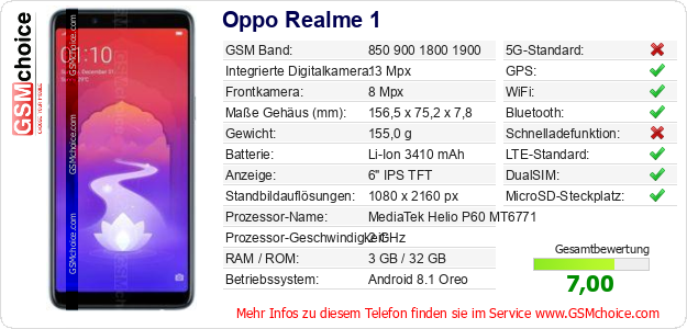 Hast du eigene Webseite? Willst du die Informationen über Standarddaten des Handys Oppo Realme 1 irgendwo veröffentlichen? Das ist sehr einfach. Du kannst das Bild herunterladen oder kopieren und auf der Webseite folgenden Code hinzufügen:Das Einfügen von diesem Code verursacht das Anzeigen von dem folgenden Bild:
