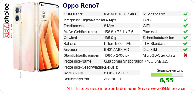 Hast du eigene Webseite? Willst du die Informationen über Standarddaten des Handys Oppo Reno7 irgendwo veröffentlichen? Das ist sehr einfach. Du kannst das Bild herunterladen oder kopieren und auf der Webseite folgenden Code hinzufügen:Das Einfügen von diesem Code verursacht das Anzeigen von dem folgenden Bild: