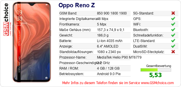 Hast du eigene Webseite? Willst du die Informationen über Standarddaten des Handys Oppo Reno Z irgendwo veröffentlichen? Das ist sehr einfach. Du kannst das Bild herunterladen oder kopieren und auf der Webseite folgenden Code hinzufügen:Das Einfügen von diesem Code verursacht das Anzeigen von dem folgenden Bild:
