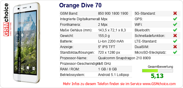 Hast du eigene Webseite? Willst du die Informationen über Standarddaten des Handys Orange Dive 70 irgendwo veröffentlichen? Das ist sehr einfach. Du kannst das Bild herunterladen oder kopieren und auf der Webseite folgenden Code hinzufügen:Das Einfügen von diesem Code verursacht das Anzeigen von dem folgenden Bild: