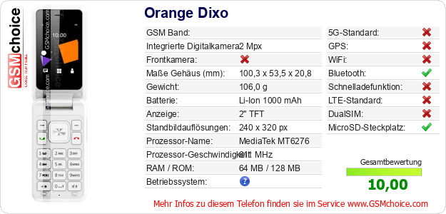 Hast du eigene Webseite? Willst du die Informationen über Standarddaten des Handys Orange Dixo irgendwo veröffentlichen? Das ist sehr einfach. Du kannst das Bild herunterladen oder kopieren und auf der Webseite folgenden Code hinzufügen:Das Einfügen von diesem Code verursacht das Anzeigen von dem folgenden Bild: