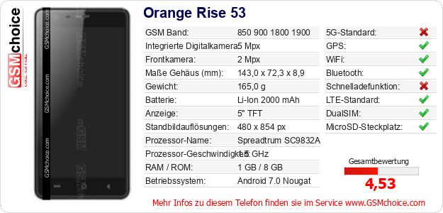 Hast du eigene Webseite? Willst du die Informationen über Standarddaten des Handys Orange Rise 53 irgendwo veröffentlichen? Das ist sehr einfach. Du kannst das Bild herunterladen oder kopieren und auf der Webseite folgenden Code hinzufügen:Das Einfügen von diesem Code verursacht das Anzeigen von dem folgenden Bild: