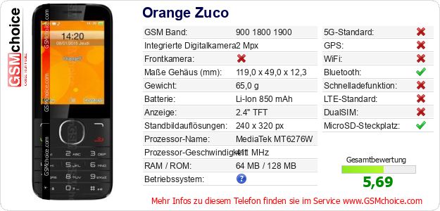 Hast du eigene Webseite? Willst du die Informationen über Standarddaten des Handys Orange Zuco irgendwo veröffentlichen? Das ist sehr einfach. Du kannst das Bild herunterladen oder kopieren und auf der Webseite folgenden Code hinzufügen:Das Einfügen von diesem Code verursacht das Anzeigen von dem folgenden Bild: