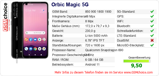 Hast du eigene Webseite? Willst du die Informationen über Standarddaten des Handys Orbic Magic 5G irgendwo veröffentlichen? Das ist sehr einfach. Du kannst das Bild herunterladen oder kopieren und auf der Webseite folgenden Code hinzufügen:Das Einfügen von diesem Code verursacht das Anzeigen von dem folgenden Bild: