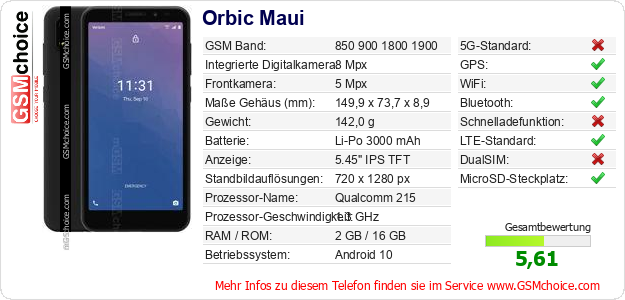Hast du eigene Webseite? Willst du die Informationen über Standarddaten des Handys Orbic Maui irgendwo veröffentlichen? Das ist sehr einfach. Du kannst das Bild herunterladen oder kopieren und auf der Webseite folgenden Code hinzufügen:Das Einfügen von diesem Code verursacht das Anzeigen von dem folgenden Bild: