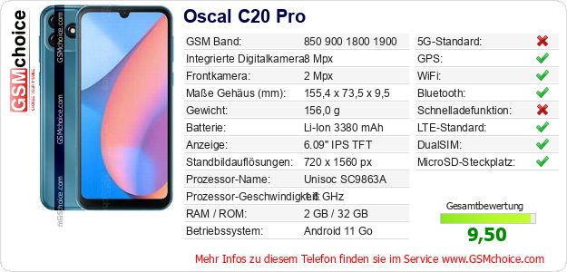 Hast du eigene Webseite? Willst du die Informationen über Standarddaten des Handys Oscal C20 Pro irgendwo veröffentlichen? Das ist sehr einfach. Du kannst das Bild herunterladen oder kopieren und auf der Webseite folgenden Code hinzufügen:Das Einfügen von diesem Code verursacht das Anzeigen von dem folgenden Bild: