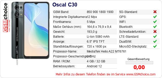 Hast du eigene Webseite? Willst du die Informationen über Standarddaten des Handys Oscal C30 irgendwo veröffentlichen? Das ist sehr einfach. Du kannst das Bild herunterladen oder kopieren und auf der Webseite folgenden Code hinzufügen:Das Einfügen von diesem Code verursacht das Anzeigen von dem folgenden Bild: