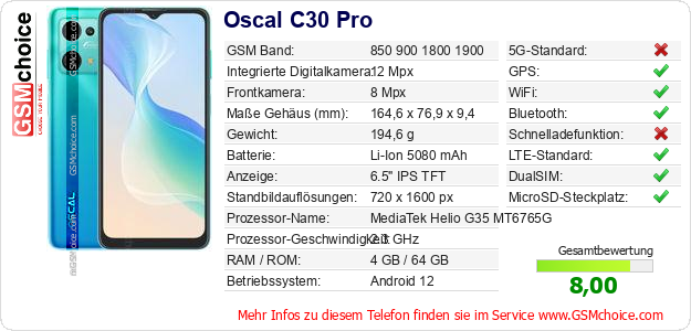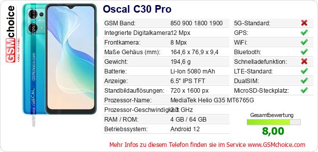 Hast du eigene Webseite? Willst du die Informationen über Standarddaten des Handys Oscal C30 Pro irgendwo veröffentlichen? Das ist sehr einfach. Du kannst das Bild herunterladen oder kopieren und auf der Webseite folgenden Code hinzufügen:Das Einfügen von diesem Code verursacht das Anzeigen von dem folgenden Bild: