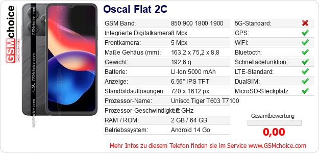 Hast du eigene Webseite? Willst du die Informationen über Standarddaten des Handys Oscal Flat 2C irgendwo veröffentlichen? Das ist sehr einfach. Du kannst das Bild herunterladen oder kopieren und auf der Webseite folgenden Code hinzufügen:Das Einfügen von diesem Code verursacht das Anzeigen von dem folgenden Bild:
