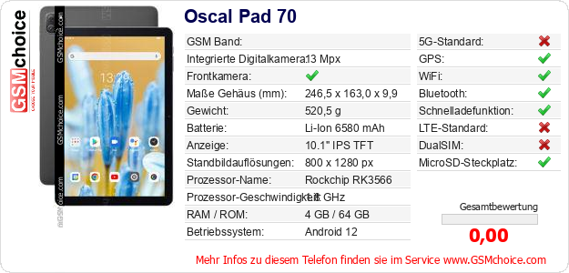 Hast du eigene Webseite? Willst du die Informationen über Standarddaten des Handys Oscal Pad 70 irgendwo veröffentlichen? Das ist sehr einfach. Du kannst das Bild herunterladen oder kopieren und auf der Webseite folgenden Code hinzufügen:Das Einfügen von diesem Code verursacht das Anzeigen von dem folgenden Bild: