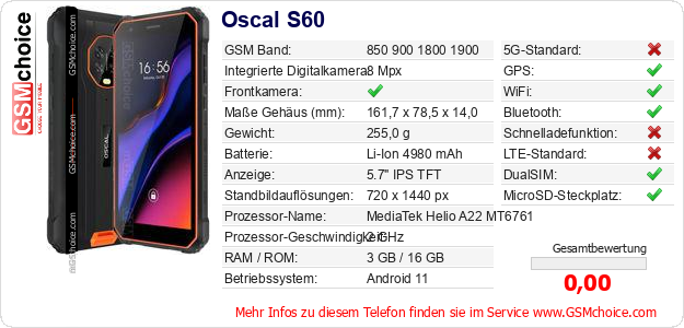 Hast du eigene Webseite? Willst du die Informationen über Standarddaten des Handys Oscal S60 irgendwo veröffentlichen? Das ist sehr einfach. Du kannst das Bild herunterladen oder kopieren und auf der Webseite folgenden Code hinzufügen:Das Einfügen von diesem Code verursacht das Anzeigen von dem folgenden Bild: