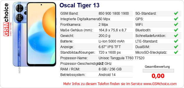 Hast du eigene Webseite? Willst du die Informationen über Standarddaten des Handys Oscal Tiger 13 irgendwo veröffentlichen? Das ist sehr einfach. Du kannst das Bild herunterladen oder kopieren und auf der Webseite folgenden Code hinzufügen:Das Einfügen von diesem Code verursacht das Anzeigen von dem folgenden Bild: