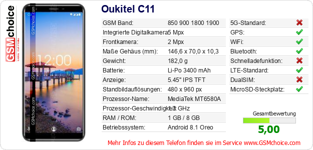 Hast du eigene Webseite? Willst du die Informationen über Standarddaten des Handys Oukitel C11 irgendwo veröffentlichen? Das ist sehr einfach. Du kannst das Bild herunterladen oder kopieren und auf der Webseite folgenden Code hinzufügen:Das Einfügen von diesem Code verursacht das Anzeigen von dem folgenden Bild: