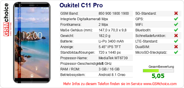 Hast du eigene Webseite? Willst du die Informationen über Standarddaten des Handys Oukitel C11 Pro irgendwo veröffentlichen? Das ist sehr einfach. Du kannst das Bild herunterladen oder kopieren und auf der Webseite folgenden Code hinzufügen:Das Einfügen von diesem Code verursacht das Anzeigen von dem folgenden Bild: