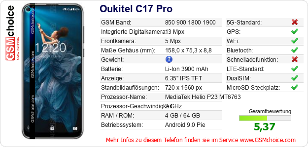 Hast du eigene Webseite? Willst du die Informationen über Standarddaten des Handys Oukitel C17 Pro irgendwo veröffentlichen? Das ist sehr einfach. Du kannst das Bild herunterladen oder kopieren und auf der Webseite folgenden Code hinzufügen:Das Einfügen von diesem Code verursacht das Anzeigen von dem folgenden Bild: