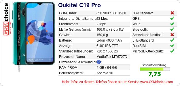 Hast du eigene Webseite? Willst du die Informationen über Standarddaten des Handys Oukitel C19 Pro irgendwo veröffentlichen? Das ist sehr einfach. Du kannst das Bild herunterladen oder kopieren und auf der Webseite folgenden Code hinzufügen:Das Einfügen von diesem Code verursacht das Anzeigen von dem folgenden Bild: