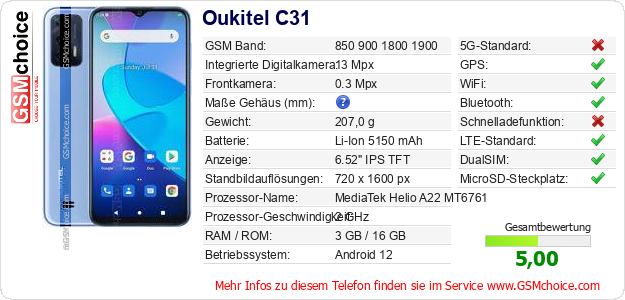 Hast du eigene Webseite? Willst du die Informationen über Standarddaten des Handys Oukitel C31 irgendwo veröffentlichen? Das ist sehr einfach. Du kannst das Bild herunterladen oder kopieren und auf der Webseite folgenden Code hinzufügen:Das Einfügen von diesem Code verursacht das Anzeigen von dem folgenden Bild: