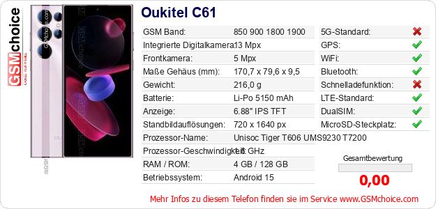 Hast du eigene Webseite? Willst du die Informationen über Standarddaten des Handys Oukitel C61 irgendwo veröffentlichen? Das ist sehr einfach. Du kannst das Bild herunterladen oder kopieren und auf der Webseite folgenden Code hinzufügen:Das Einfügen von diesem Code verursacht das Anzeigen von dem folgenden Bild: