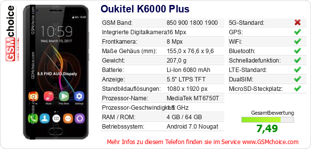 Daten des Mobiltelefons Oukitel K6000 Plus auf Ihrer Seite