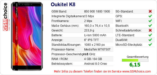 Hast du eigene Webseite? Willst du die Informationen über Standarddaten des Handys Oukitel K8 irgendwo veröffentlichen? Das ist sehr einfach. Du kannst das Bild herunterladen oder kopieren und auf der Webseite folgenden Code hinzufügen:Das Einfügen von diesem Code verursacht das Anzeigen von dem folgenden Bild:
