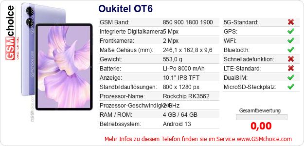 Hast du eigene Webseite? Willst du die Informationen über Standarddaten des Handys Oukitel OT6 irgendwo veröffentlichen? Das ist sehr einfach. Du kannst das Bild herunterladen oder kopieren und auf der Webseite folgenden Code hinzufügen:Das Einfügen von diesem Code verursacht das Anzeigen von dem folgenden Bild: