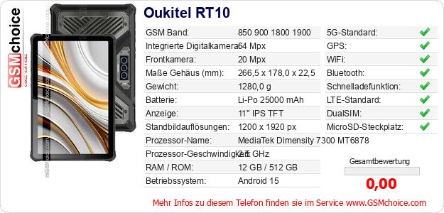 Hast du eigene Webseite? Willst du die Informationen über Standarddaten des Handys Oukitel RT10 irgendwo veröffentlichen? Das ist sehr einfach. Du kannst das Bild herunterladen oder kopieren und auf der Webseite folgenden Code hinzufügen:Das Einfügen von diesem Code verursacht das Anzeigen von dem folgenden Bild: