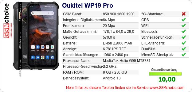 Hast du eigene Webseite? Willst du die Informationen über Standarddaten des Handys Oukitel WP19 Pro irgendwo veröffentlichen? Das ist sehr einfach. Du kannst das Bild herunterladen oder kopieren und auf der Webseite folgenden Code hinzufügen:Das Einfügen von diesem Code verursacht das Anzeigen von dem folgenden Bild: