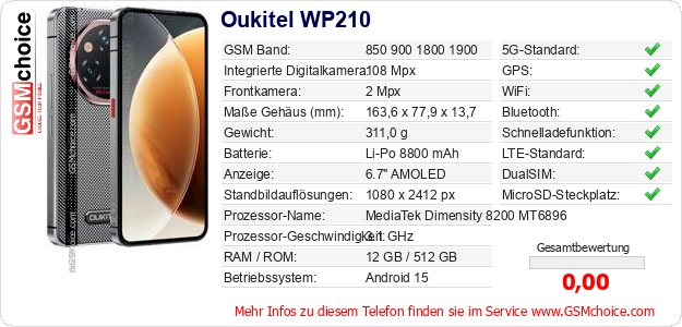 Hast du eigene Webseite? Willst du die Informationen über Standarddaten des Handys Oukitel WP210 irgendwo veröffentlichen? Das ist sehr einfach. Du kannst das Bild herunterladen oder kopieren und auf der Webseite folgenden Code hinzufügen:Das Einfügen von diesem Code verursacht das Anzeigen von dem folgenden Bild: