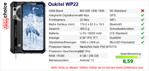 Hast du eigene Webseite? Willst du die Informationen über Standarddaten des Handys Oukitel WP22 irgendwo veröffentlichen? Das ist sehr einfach. Du kannst das Bild herunterladen oder kopieren und auf der Webseite folgenden Code hinzufügen:Das Einfügen von diesem Code verursacht das Anzeigen von dem folgenden Bild: