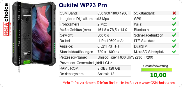Hast du eigene Webseite? Willst du die Informationen über Standarddaten des Handys Oukitel WP23 Pro irgendwo veröffentlichen? Das ist sehr einfach. Du kannst das Bild herunterladen oder kopieren und auf der Webseite folgenden Code hinzufügen:Das Einfügen von diesem Code verursacht das Anzeigen von dem folgenden Bild: