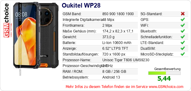 Hast du eigene Webseite? Willst du die Informationen über Standarddaten des Handys Oukitel WP28 irgendwo veröffentlichen? Das ist sehr einfach. Du kannst das Bild herunterladen oder kopieren und auf der Webseite folgenden Code hinzufügen:Das Einfügen von diesem Code verursacht das Anzeigen von dem folgenden Bild: