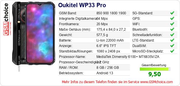 Hast du eigene Webseite? Willst du die Informationen über Standarddaten des Handys Oukitel WP33 Pro irgendwo veröffentlichen? Das ist sehr einfach. Du kannst das Bild herunterladen oder kopieren und auf der Webseite folgenden Code hinzufügen:Das Einfügen von diesem Code verursacht das Anzeigen von dem folgenden Bild: