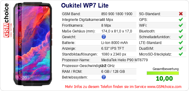 Hast du eigene Webseite? Willst du die Informationen über Standarddaten des Handys Oukitel WP7 Lite irgendwo veröffentlichen? Das ist sehr einfach. Du kannst das Bild herunterladen oder kopieren und auf der Webseite folgenden Code hinzufügen:Das Einfügen von diesem Code verursacht das Anzeigen von dem folgenden Bild: