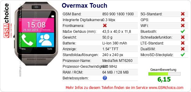 Hast du eigene Webseite? Willst du die Informationen über Standarddaten des Handys Overmax Touch irgendwo veröffentlichen? Das ist sehr einfach. Du kannst das Bild herunterladen oder kopieren und auf der Webseite folgenden Code hinzufügen:Das Einfügen von diesem Code verursacht das Anzeigen von dem folgenden Bild: