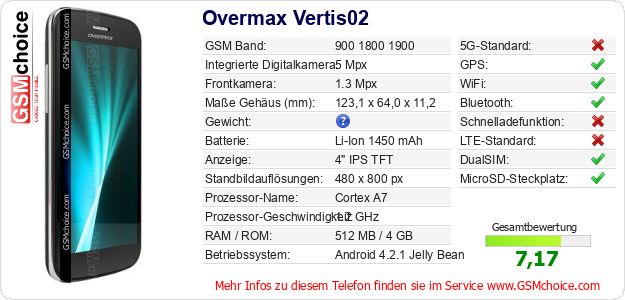 Hast du eigene Webseite? Willst du die Informationen über Standarddaten des Handys Overmax Vertis02 irgendwo veröffentlichen? Das ist sehr einfach. Du kannst das Bild herunterladen oder kopieren und auf der Webseite folgenden Code hinzufügen:Das Einfügen von diesem Code verursacht das Anzeigen von dem folgenden Bild: