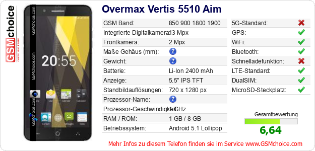 Hast du eigene Webseite? Willst du die Informationen über Standarddaten des Handys Overmax Vertis 5510 Aim irgendwo veröffentlichen? Das ist sehr einfach. Du kannst das Bild herunterladen oder kopieren und auf der Webseite folgenden Code hinzufügen:Das Einfügen von diesem Code verursacht das Anzeigen von dem folgenden Bild: