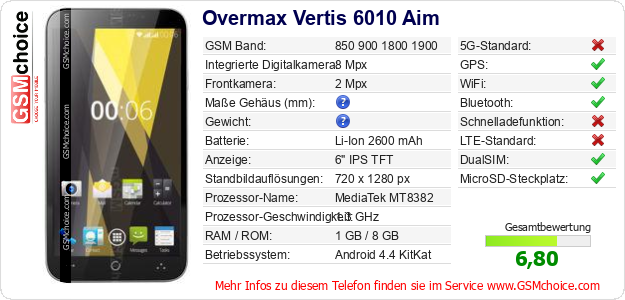 Hast du eigene Webseite? Willst du die Informationen über Standarddaten des Handys Overmax Vertis 6010 Aim irgendwo veröffentlichen? Das ist sehr einfach. Du kannst das Bild herunterladen oder kopieren und auf der Webseite folgenden Code hinzufügen:Das Einfügen von diesem Code verursacht das Anzeigen von dem folgenden Bild: