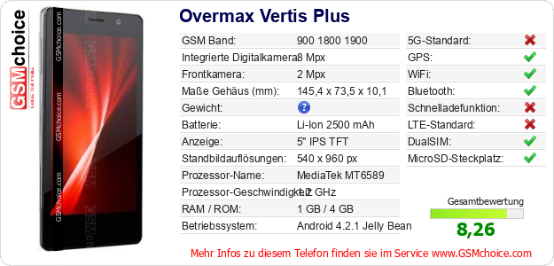Hast du eigene Webseite? Willst du die Informationen über Standarddaten des Handys Overmax Vertis Plus irgendwo veröffentlichen? Das ist sehr einfach. Du kannst das Bild herunterladen oder kopieren und auf der Webseite folgenden Code hinzufügen:Das Einfügen von diesem Code verursacht das Anzeigen von dem folgenden Bild: