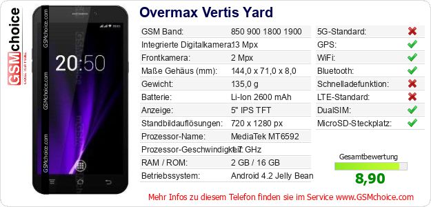 Hast du eigene Webseite? Willst du die Informationen über Standarddaten des Handys Overmax Vertis Yard irgendwo veröffentlichen? Das ist sehr einfach. Du kannst das Bild herunterladen oder kopieren und auf der Webseite folgenden Code hinzufügen:Das Einfügen von diesem Code verursacht das Anzeigen von dem folgenden Bild: