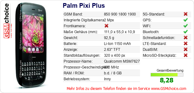 Hast du eigene Webseite? Willst du die Informationen über Standarddaten des Handys Palm Pixi Plus irgendwo veröffentlichen? Das ist sehr einfach. Du kannst das Bild herunterladen oder kopieren und auf der Webseite folgenden Code hinzufügen:Das Einfügen von diesem Code verursacht das Anzeigen von dem folgenden Bild: