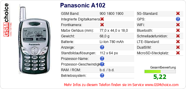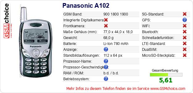 Hast du eigene Webseite? Willst du die Informationen über Standarddaten des Handys Panasonic A102 irgendwo veröffentlichen? Das ist sehr einfach. Du kannst das Bild herunterladen oder kopieren und auf der Webseite folgenden Code hinzufügen:Das Einfügen von diesem Code verursacht das Anzeigen von dem folgenden Bild: