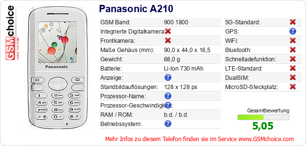 Hast du eigene Webseite? Willst du die Informationen über Standarddaten des Handys Panasonic A210 irgendwo veröffentlichen? Das ist sehr einfach. Du kannst das Bild herunterladen oder kopieren und auf der Webseite folgenden Code hinzufügen:Das Einfügen von diesem Code verursacht das Anzeigen von dem folgenden Bild: